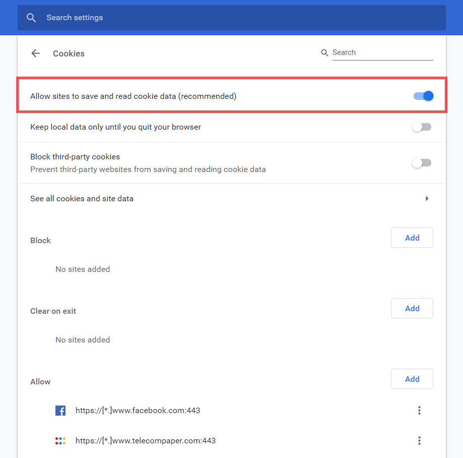 If you wish to enable cookies only for a handful of sites but not all, then click the Add button next to the Allow section and add the website you wish to enable cookies for.