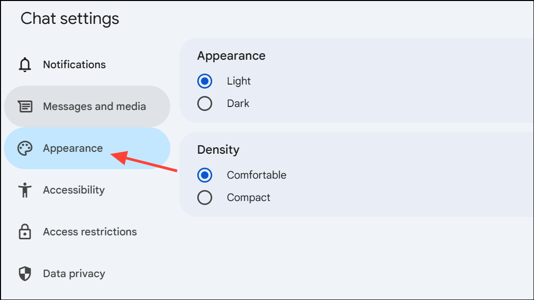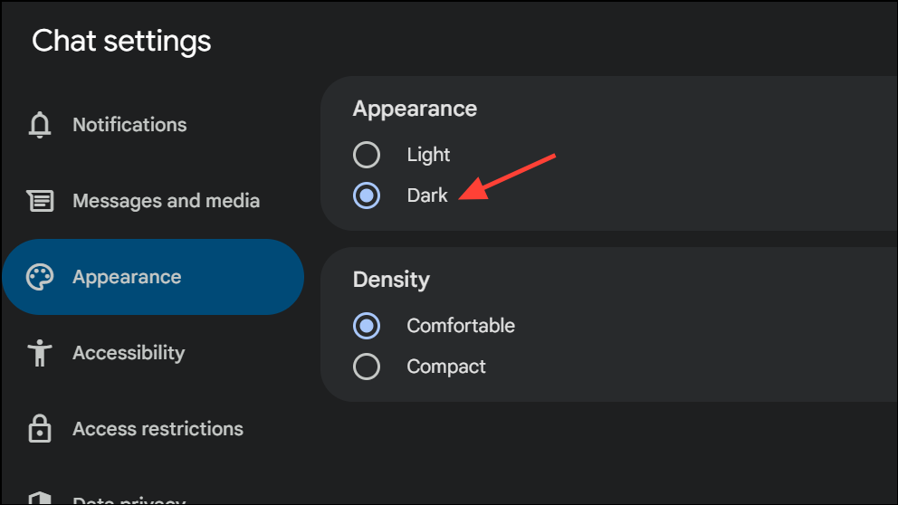 Step 3: Select “Dark” under the Appearance section. All compatible apps, including Google Chat, will now use dark mode.