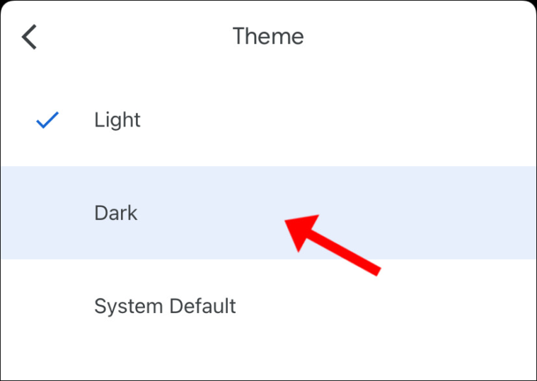 Step 4: Choose 'Dark' from the list of themes. A checkmark will indicate your selection.