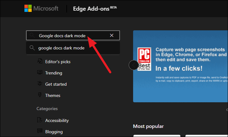Step 1: Open Edge and go to the Edge Add-ons store at microsoftedge.microsoft.com/addons. Search for 'Google docs dark mode' in the search bar.