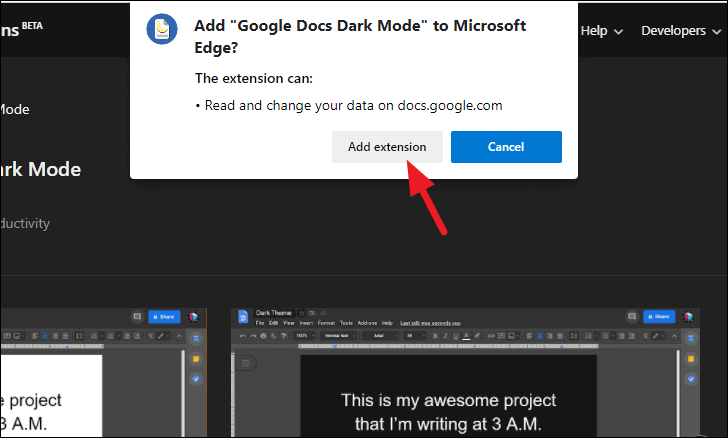 Step 4: A confirmation dialog will appear, informing you that the extension can read and change your data on docs.google.com. If you agree, click 'Add extension'.