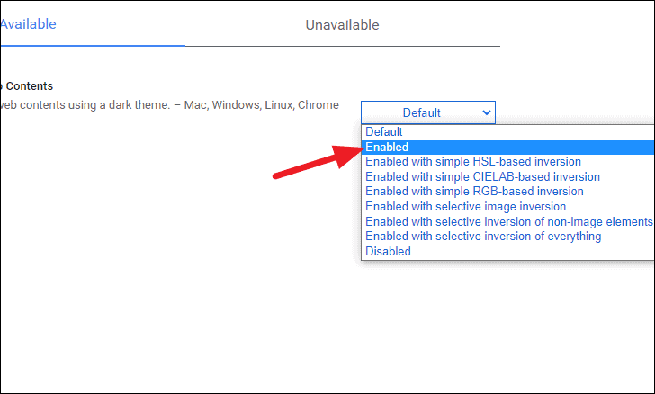 Step 3: Find 'Force Dark Mode for Web Contents' and select 'Enabled' from the dropdown menu next to it.