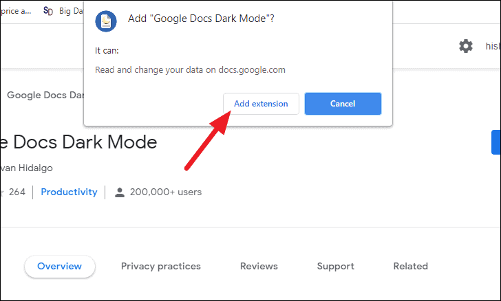 While this extension is convenient, be aware that it requires permission to access your data on Google Docs. If privacy is a concern, consider using the method that forces dark mode through Chrome's settings.