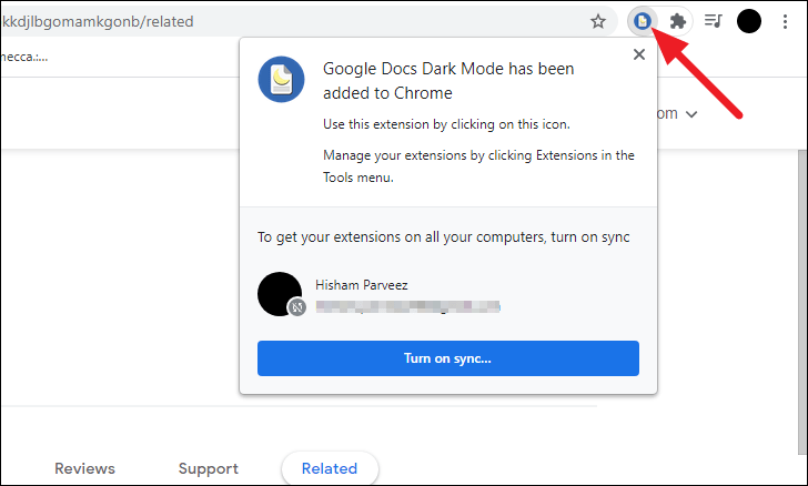 Step 5: After installation, the extension icon will appear next to the address bar. To keep it visible, click on the puzzle icon (Extensions) and pin the 'Google Docs Dark Mode' extension.