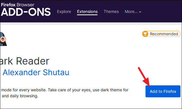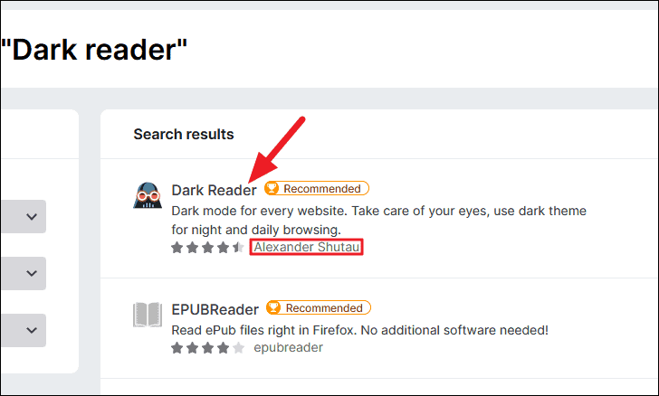 Step 3: Click on the 'Dark Reader' extension offered by Alexander Shutau to view its details.