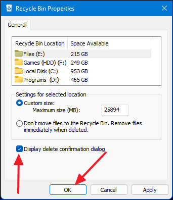 - In the Recycle Bin Properties window, check the box next to Display delete confirmation dialog.