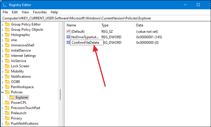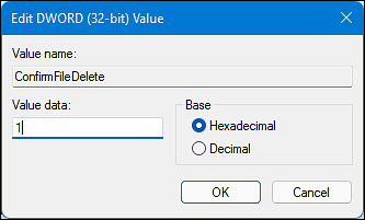 ConfirmFileDelete, set the Value data to1, and click OK.