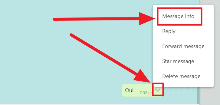 On WhatsApp Desktop App and Web Client. Launch your WhatsApp web client or desktop application and head onto a group chat. Hover the cursor over a text you sent and click the downward-facing arrowhead. Now, select ‘Message info’ from the context menu.