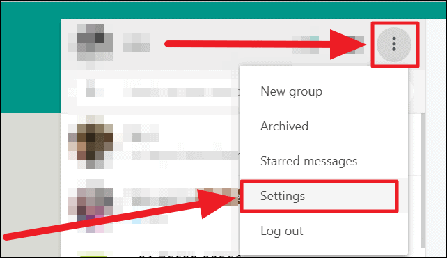 Launch your WhatsApp desktop app or log in to the WhatsApp web app and click the ellipsis icon (three horizontal dots) at the top left of the screen. Choose ‘Settings’ in the drop-down menu.