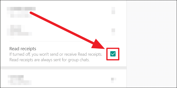 Click the tiny checkbox next to ‘Read receipts’ to check it. An unchecked box determines disabled ‘read receipts’ and a checked box enabled ‘read receipts’.