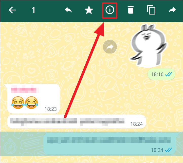 On WhatsApp Mobile App. Launch WhatsApp and open a group chat. Long tap on a text message you sent and then tap the circular ‘i’ icon on the chat’s ribbon.