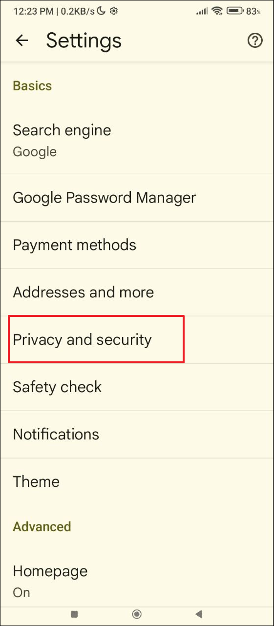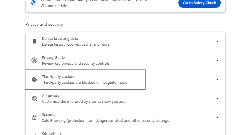 - In the Privacy and Security section, click on 'Third-party cookies'.