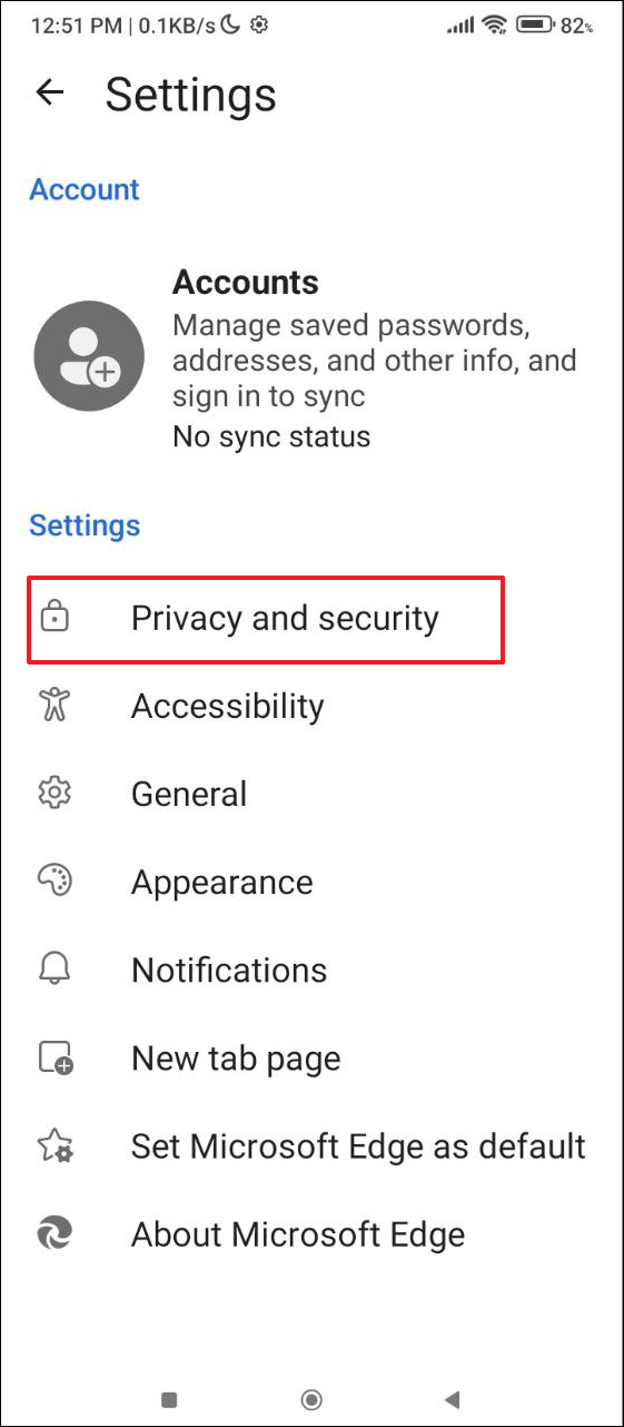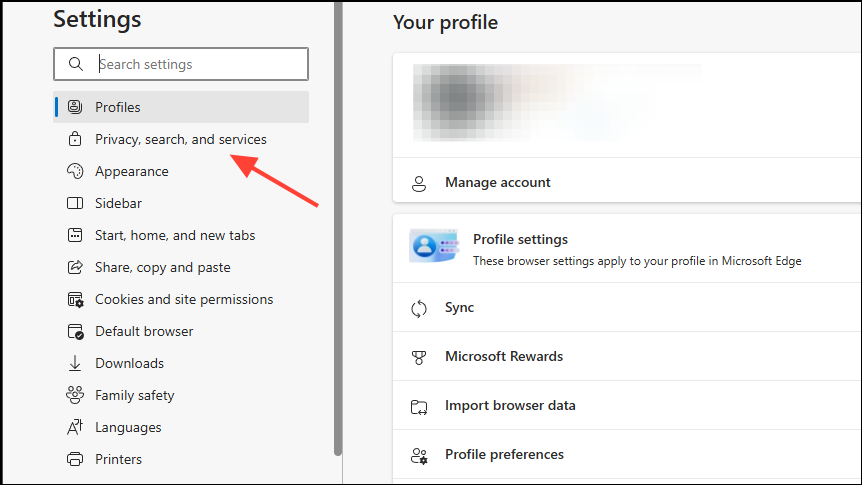 - When the Settings page opens, click on 'Privacy and Security' on the left.