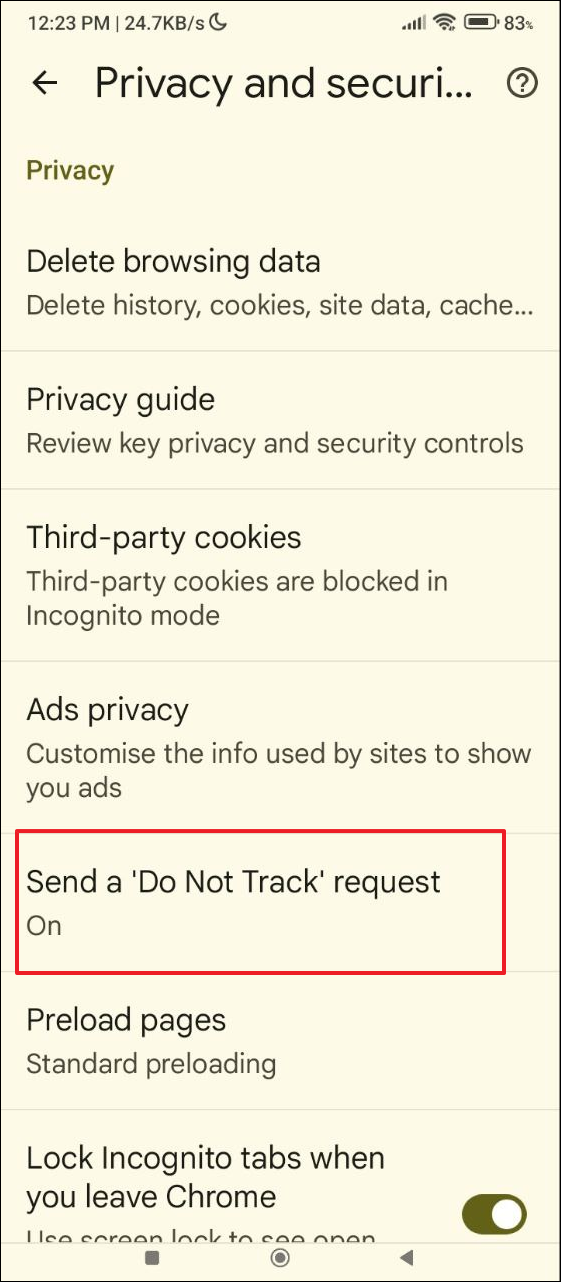 - On the next page, tap on the toggle for the 'Send a Do Not Track request' option.