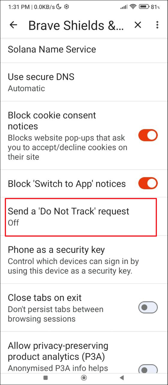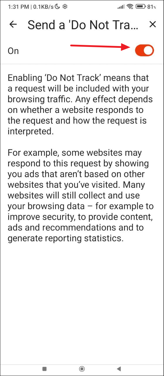 - Finally, tap on the 'Send a Do Not Track' request toggle at the top to enable the option.