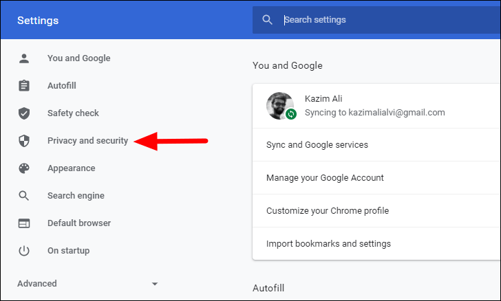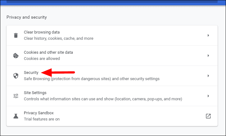 In the browser settings, select ‘Privacy and security’ from the navigation pane on the left.