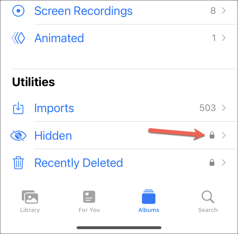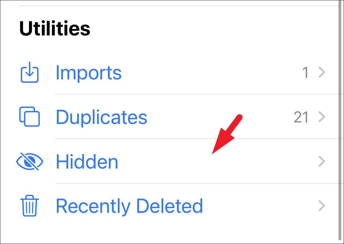 You can access the ‘Hidden’ album from the ‘Utilities’ section present under the ‘Albums’ tab.