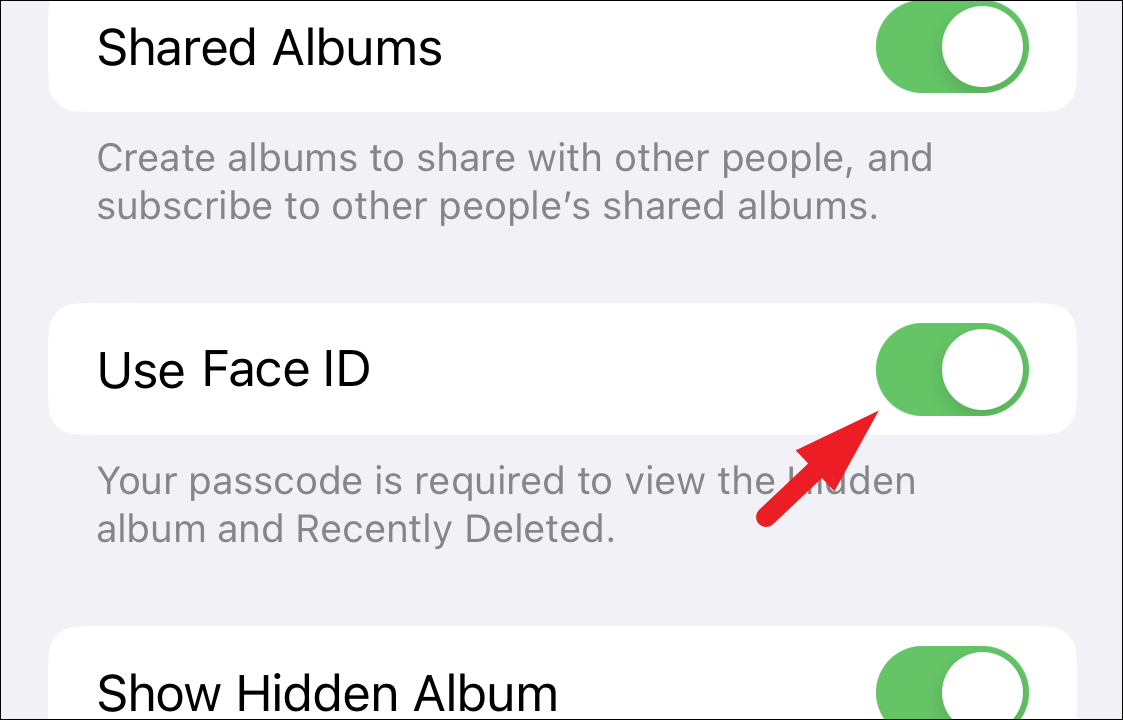 Now, if you or someone else meddling with your iPhone previously disabled authentication for the hidden album, you can quickly toggle it on from the Settings app. Moreover, if you have turned off your Face ID or Touch ID, you will be able to use your iPhone passcode.