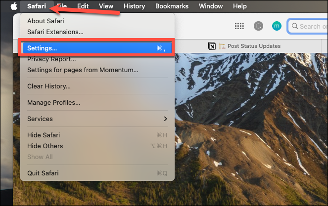 Step 2: Click on the Safari menu in the top-left corner of the screen and select Settings. Alternatively, press Cmd + , on your keyboard.