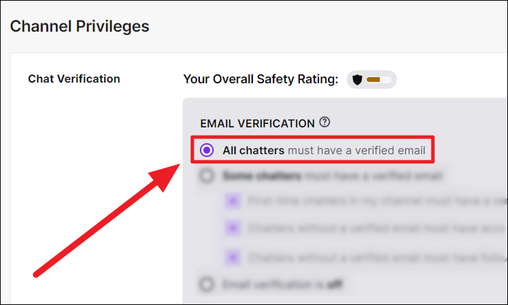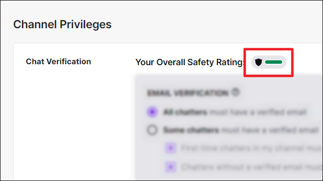 Twitch interprets your chat security on an ‘Overall Safety Rating’ (OSR) system. The toggle on this system increases and decreases along with a change of color, depicting how strong your stream chat security is — all based on your ‘Chat Verification’ option(s).