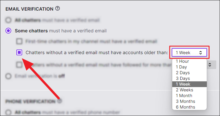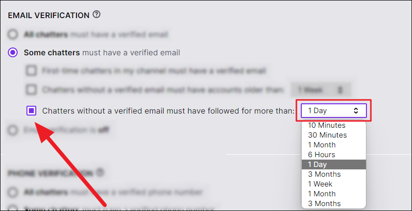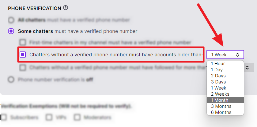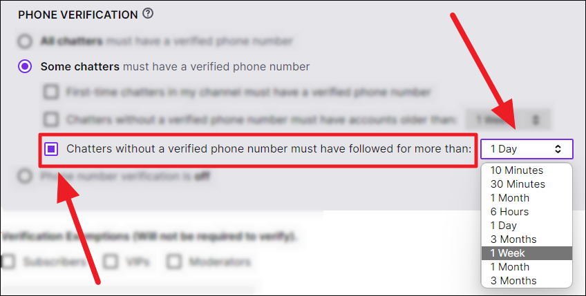 Chatters who are followers: If you want chatters to follow you for a period of time without needing to verify their phone number or have an older account on Twitch, then click the ‘Chatters without a verified phone number must have followed for more than:’ option to enable it.