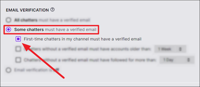 First-time chatters only: If you want only first-time chatters to verify their email before chatting on your stream, then click the radio button in front of the option that says ‘First-time chatters in my channel must have a verified email’.