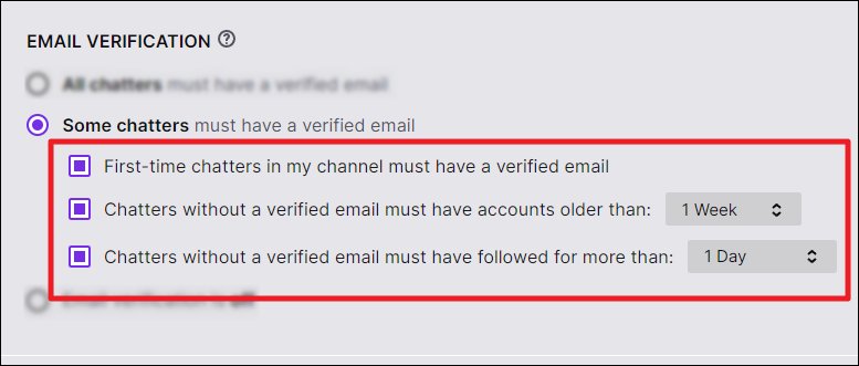 To enable these settings, stay on the same ‘Moderation’ settings page. Locate ‘Chat Verification’ under ‘Chat Privileges’. The chosen option under ‘Email Verification’ is OFF by default. There are two options you can enable here – ‘All chatters’ and ‘Some chatters’.