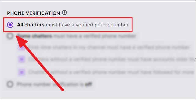 If you want all your chatters to verify their phone numbers before they can text on your stream, click the radio button in front of the ‘All chatters must have a verified phone number’ option under ‘Phone Verification’ in the ‘Chat Verification’ box.