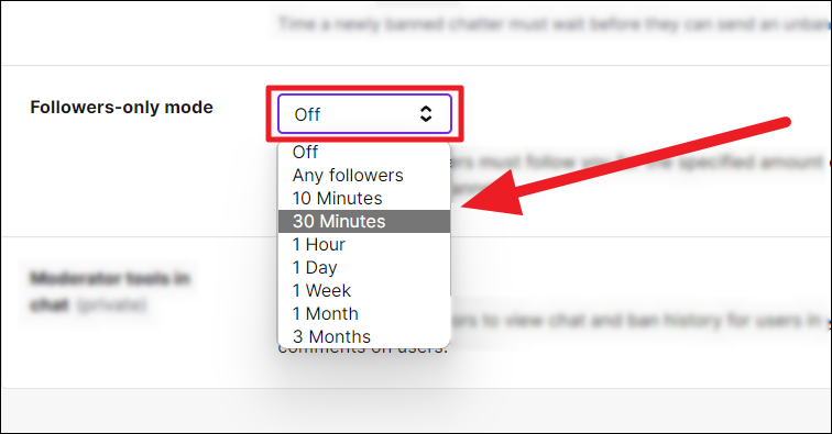 Scroll through the ‘Moderation’ settings page on the right to find the ‘Followers-only mode’ option. Click the ‘Off’ drop-down box. Now, click to apply the duration of your choice in the drop-down menu. This is the duration a viewer must follow you in order to gain permission to send messages in your stream chat.