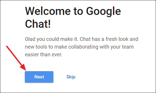 Step 11: Click on the link provided in the message to be redirected to the Google Chat welcome screen. Click 'Next' or 'Skip' to proceed.