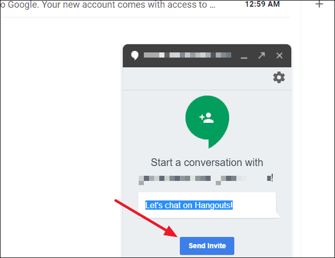 Step 3: A Google Hangouts chat window will open at the bottom right corner of your Gmail screen with a 'Send invite' button. Click 'Send invite' to send a chat request to your contact.