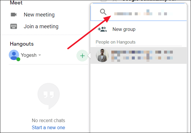 Step 2: In the search window that appears, type the name or email of the contact who has Google Chat enabled. Select their name from the 'People on Hangouts' list to start the invitation.