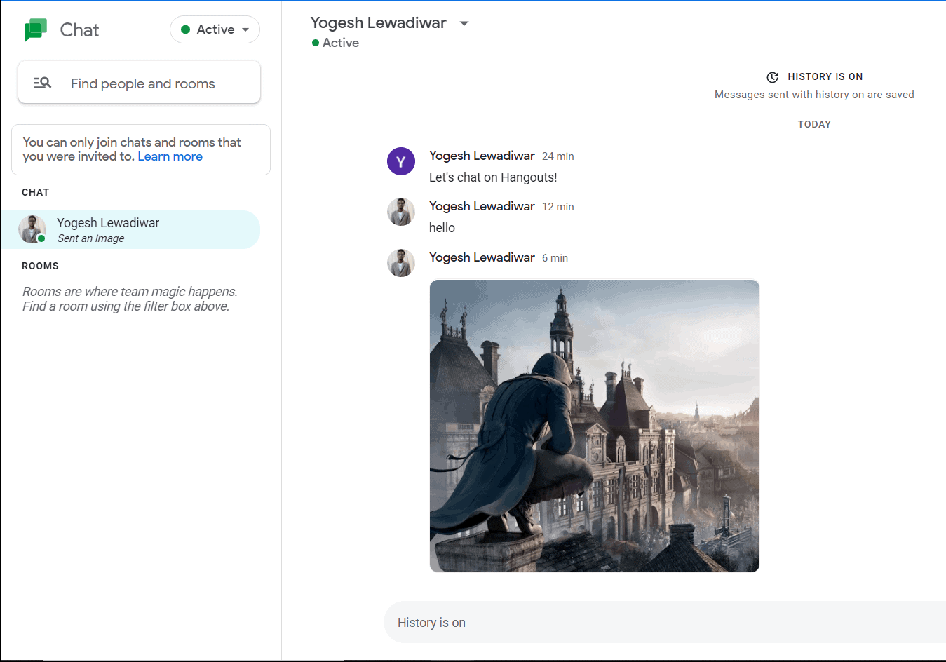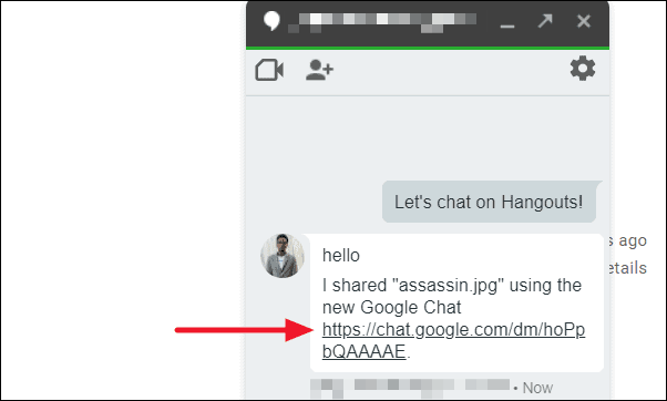 Step 10: In your Hangouts chat window, you will receive a message saying, "I shared [filename] using the new Google Chat..." along with a link to the Google Chat session.