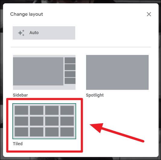 Step 4: In the layout settings, you'll notice that 'Auto' is selected by default, which adjusts the view based on the number of participants. To see all participants at once, choose the 'Tiled' layout by clicking on it.