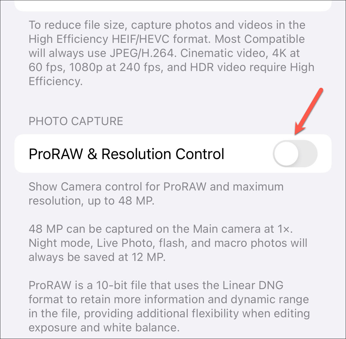 Now, if you aren't using ProRAW format already, turn on the toggle for 'ProRAW & Resolution Control'.