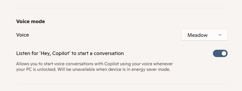 Step 4: In Voice mode, turn on “Listen for ‘Hey, Copilot’ to start a conversation.” This enables hands‑free activation using the wake phrase.