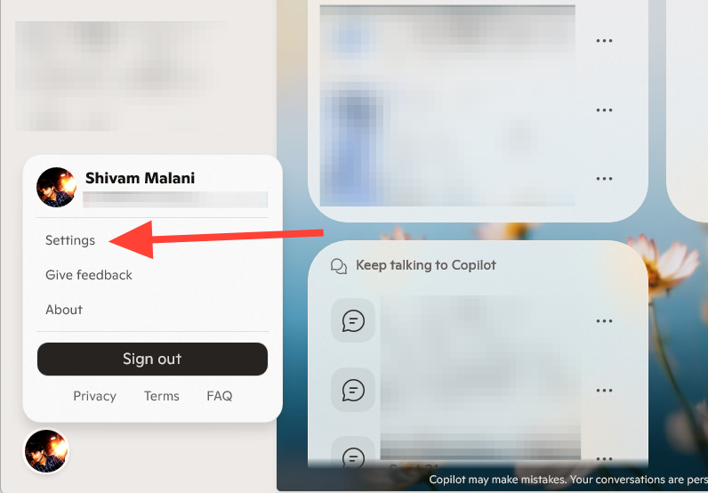 Step 3: Switch to the full Copilot window, select your Account avatar in the sidebar, then open Settings. This is where voice and keyboard options live.