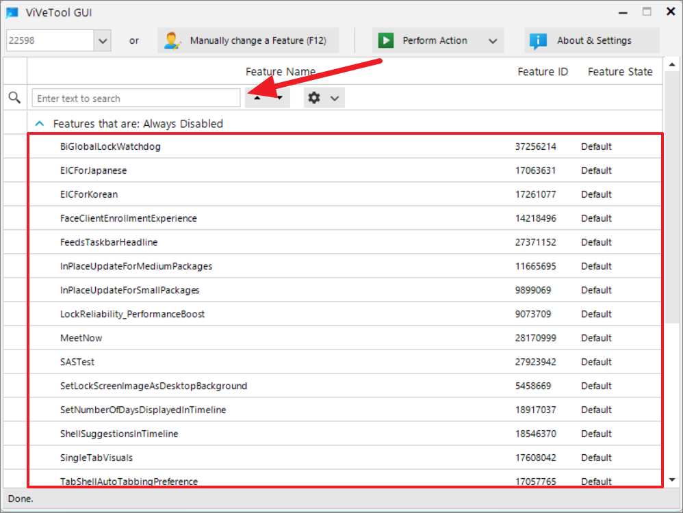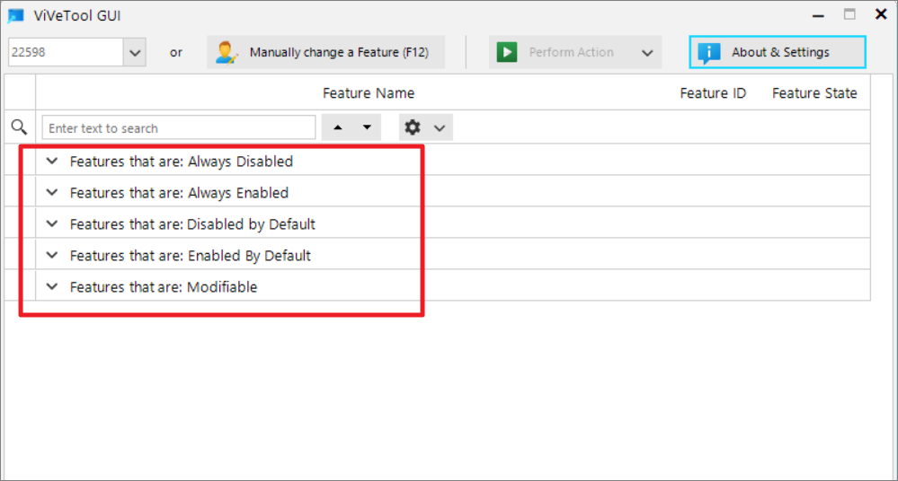 Once the scan is complete, ViVeTool GUI will categorize the hidden features into several groups: