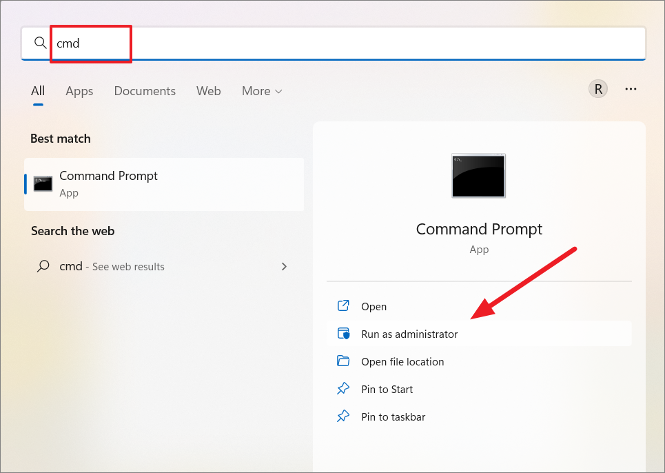 Next, open Command Prompt or PowerShell with administrator privileges. To do this, press the Windows key, type 'cmd' or 'PowerShell' in the search bar, and then click 'Run as administrator' on the right panel.