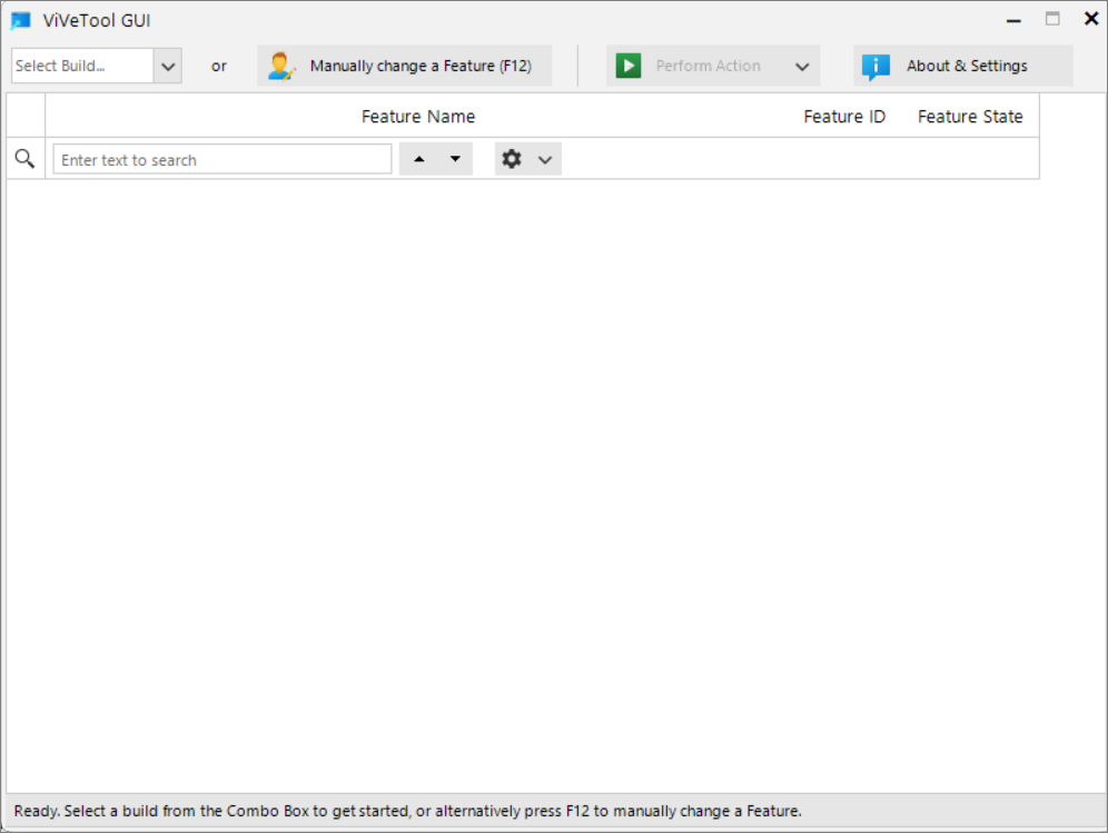 When you first open ViVeTool GUI, you'll see an empty window. Since Microsoft releases new Windows builds regularly, each with different hidden features, you'll need to select the build corresponding to your Windows 11 installation.
