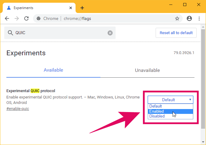 Click on the “Default” drop-down menu box next to “Experimental QUIC protocol” flag, and select “Enabled” from the available options.