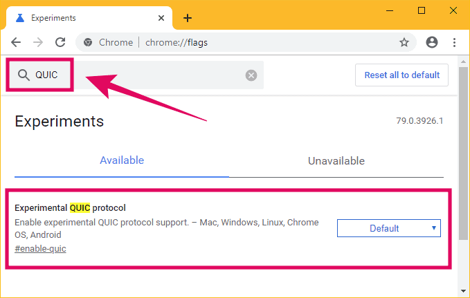 In the search box on the Experiments page, type “QUIC” in the search box and to filter out all experimental features and quickly find the “Experimental QUIC protocol” flag.