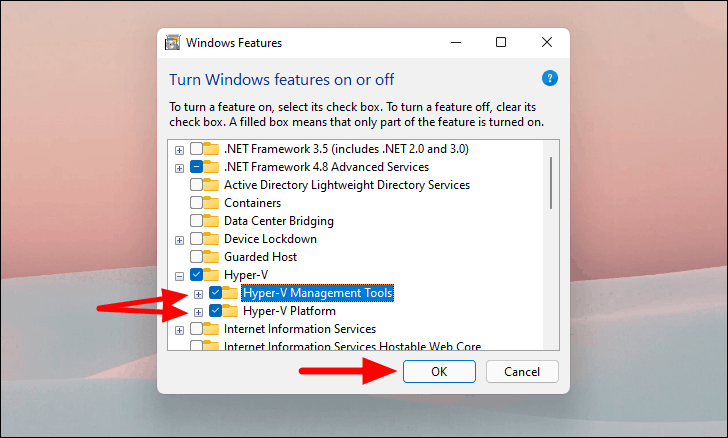 - Check the boxes for both Hyper-V Management Tools and Hyper-V Platform to enable all Hyper-V features.
