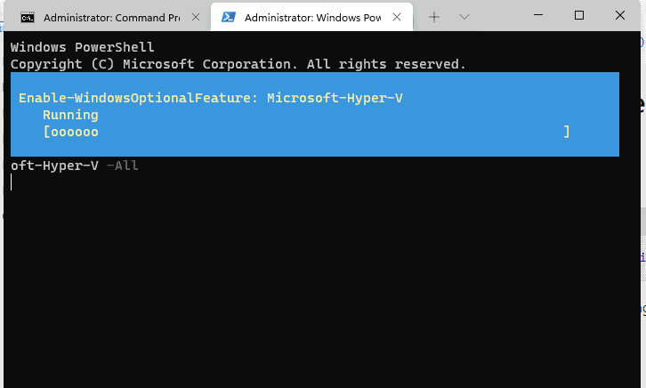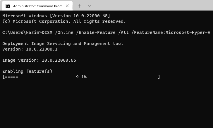 After running the command, the system will begin enabling the Hyper-V feature and display the progress in the Command Prompt window.