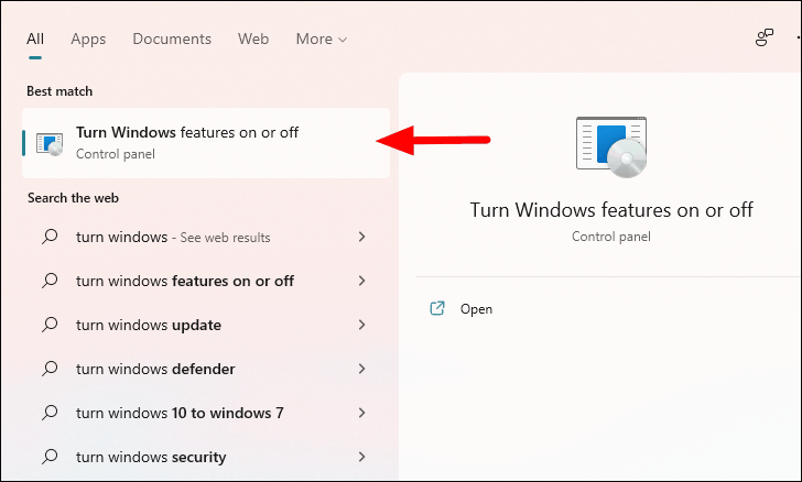 - Click the Start button and type Turn Windows features on or off, then select it from the search results.