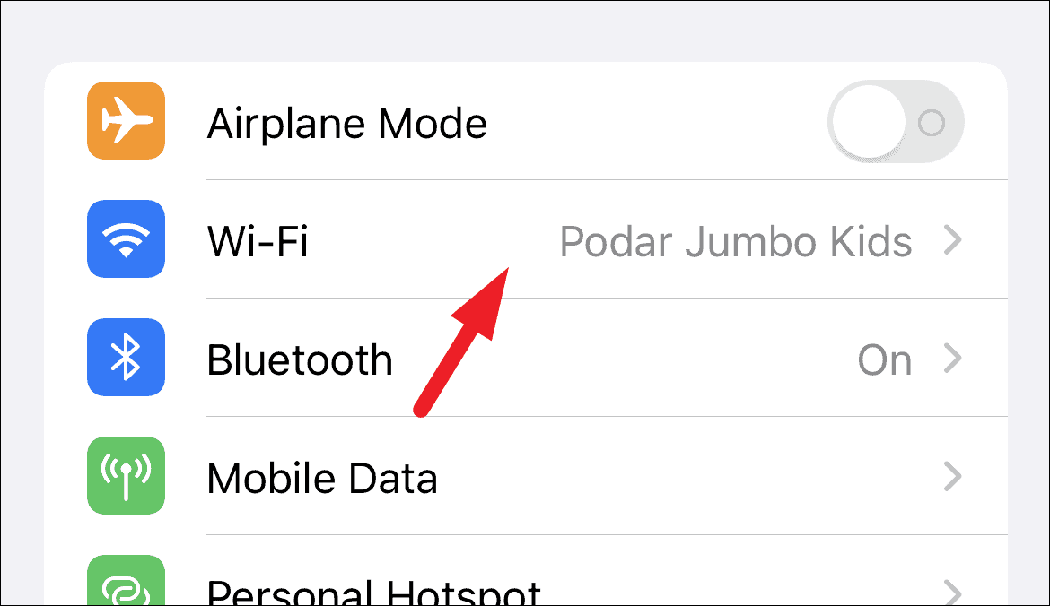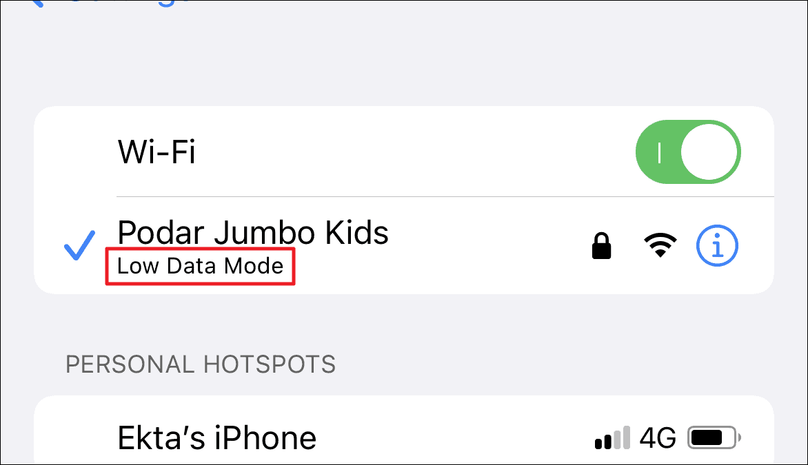 You will also be able to identify if you have turned on the ‘Low Data Mode’ for any WiFi channel from the ‘Wi-Fi’ settings screen.