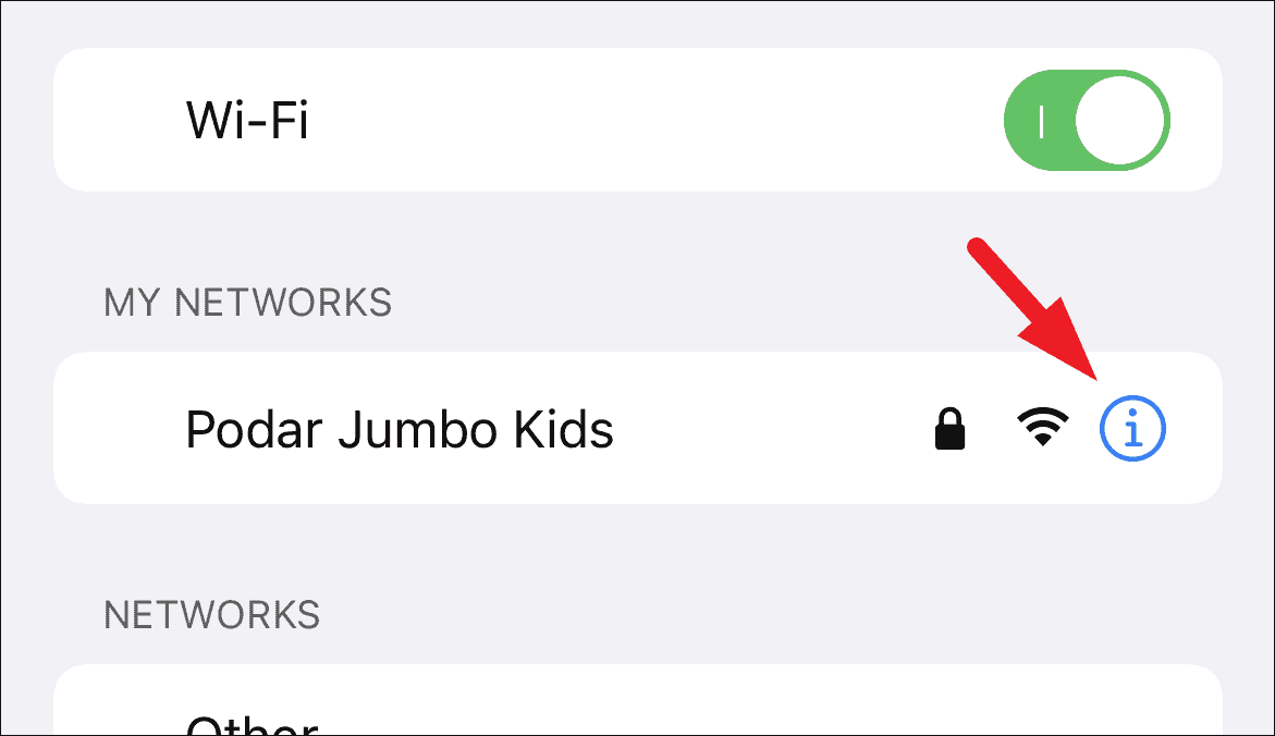 After that, tap on the ‘i’ button present on the far right edge of the connected WiFi tile on your screen.