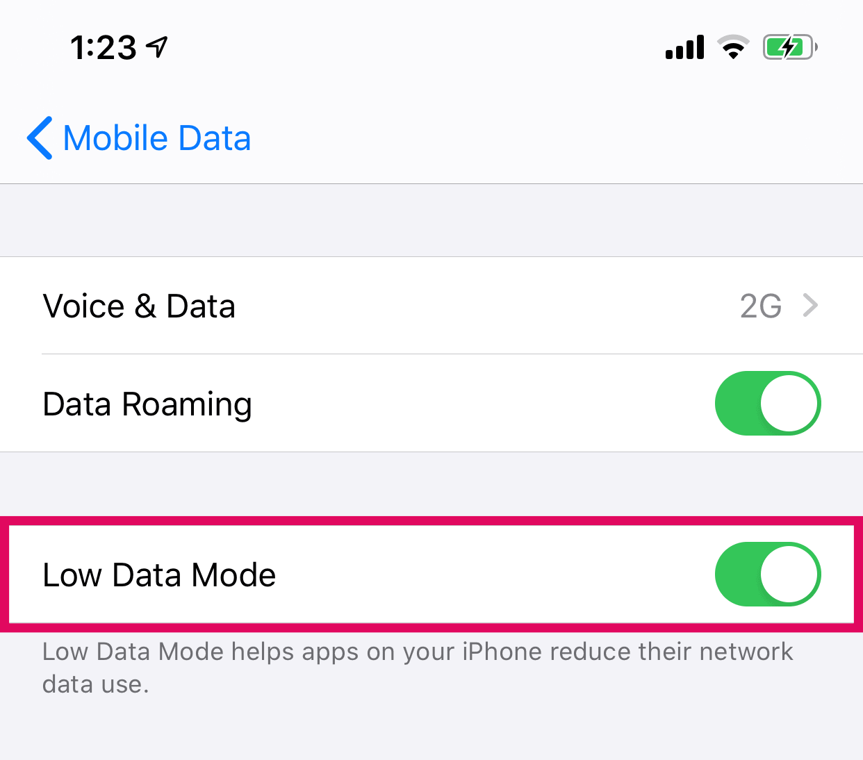 At the bottom of the selected data plan’s options screen, you’ll see the “Low Data Mode” option. Turn it on to reduce data usage on the select data plan.