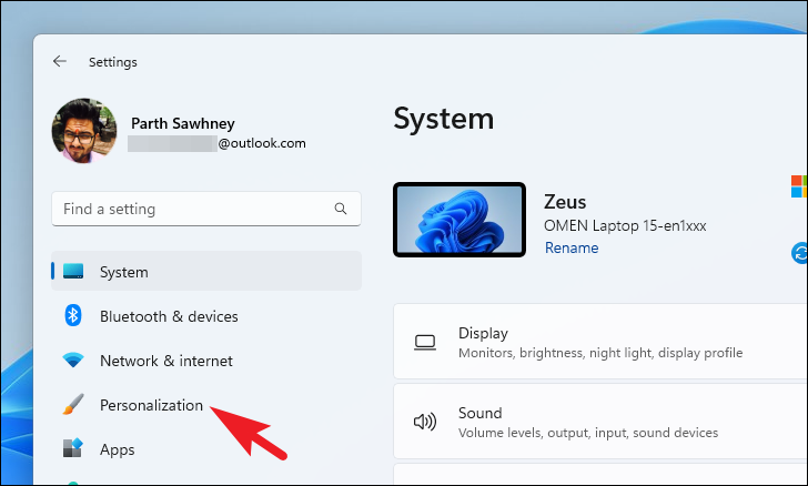 Step 2: In the Settings window, choose 'Personalization' from the left-hand sidebar to access appearance settings.