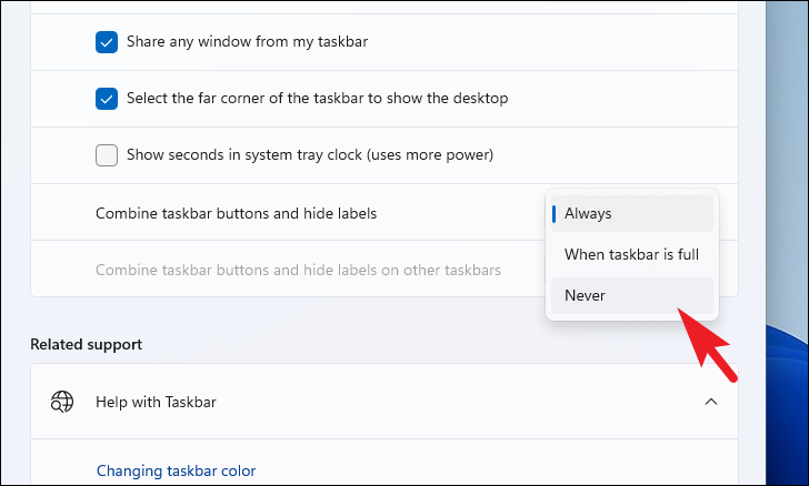 Step 4: Find the option labeled 'Combine taskbar buttons and hide labels.' Click on the dropdown menu next to it and select 'Never' to prevent the taskbar from combining buttons for the same application.